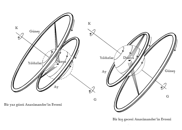 Davul şekilli Dünyanın çevresinde dönen Durağan Yıldızlar, Ay ve Güneş. Anaximander'e göre Dünyaya en yakın olan Durağan Yıldızların tekerlekleri hep birlikte bir küre oluşturur.