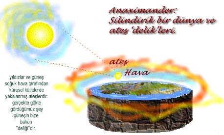 Anaximander Evrenin ayrıntılı bir modelini verdi. Dünya küresel değildi ve derinliği çapının üçte biri kadar olan bir davul şeklindeydi. Arka yüzünde de yaşam vardı ve dünya Kozmozun özeğindeydi. Başka noktalardan eşit uzaklıktaydı, olduğu yerde duruyordu, ve yıldızlar gökte ötedeki ateşi gösteren deliklerdi. Aralarında Güneş ve Ayın da bulunduğu kabul edilen Gezegenler Dünyanın çevresinde dönen araba tekerlekleri gibiydiler ve bunların çeperindeki bir delikte ateş yanıyordu. Ayın dairesi Dünyanın çapının on sekiz katı, ve Güneşin dairesi Dünyanın çapının yirmi katıydı. Güneş tutulmaları çeperdeki bu delikler tıkandığı zaman oluyordu.